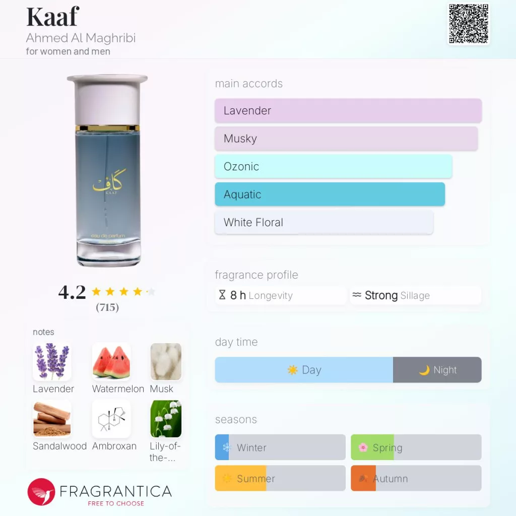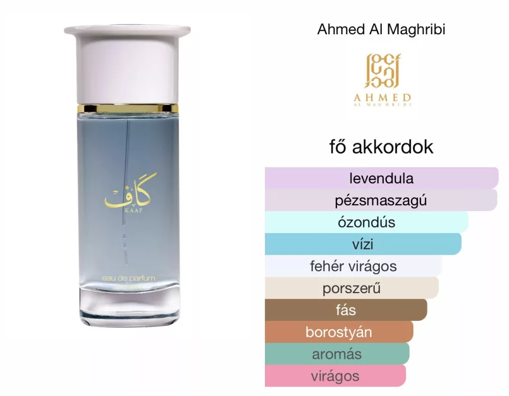 Az Ahmed Al Maghribi Kaaf egy friss, letisztult és békét sugárzó uniszex illat, amely kimondottan jól esik a meleg, nyári napokon. Már az első pillanatban magával ragad a görögdinnye, a piros gyümölcsök, a levendula és a szicíliai narancs üdítő, ragyogó frissessége, amely azonnal energiát ad és felfrissít. A szívjegyekben kibontakozó jázmin és gyöngyvirág elegáns, finoman nőies virágos harmóniája lágyítja és kifinomultabbá teszi az illatot. Az alapjegyek biztosította stabil lezárás kiegyensúlyozott, tartós összhatást eredményez, amely egész nap kellemesen körbelengi viselőjét. A Kaaf vetítése és tartóssága kiemelkedően jó: bőrön hosszan megmarad, ruhán pedig akár 10–12 órán keresztül is érezhető, így ideális választás mindennapi használatra és különleges alkalmakra egyaránt.