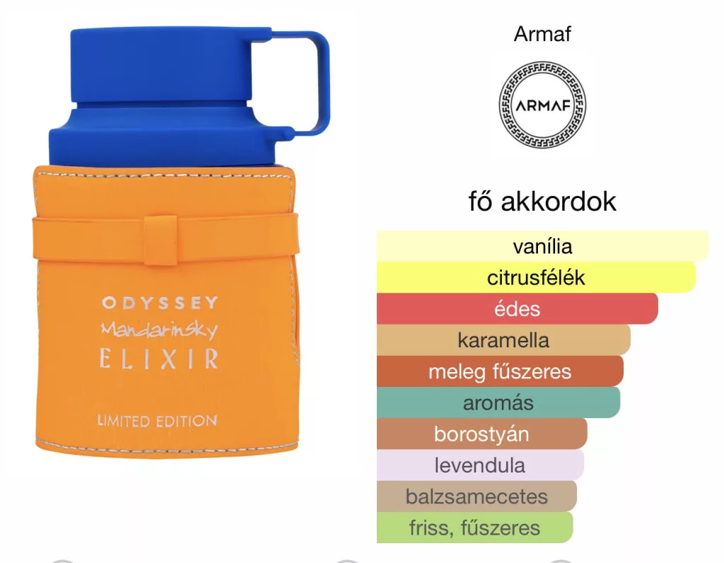 Fej illat: fekete bors, levendula, mandarin, narancs, kardamon