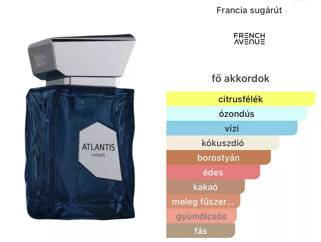 A French Avenue Atlantis egy modern, uniszex illat, amely tökéletes választás mindennapi viseletre, ugyanakkor esti alkalmakra is ideális, ha egy frissítő, mégis karakteres és emlékezetes illattal szeretnél megjelenni.