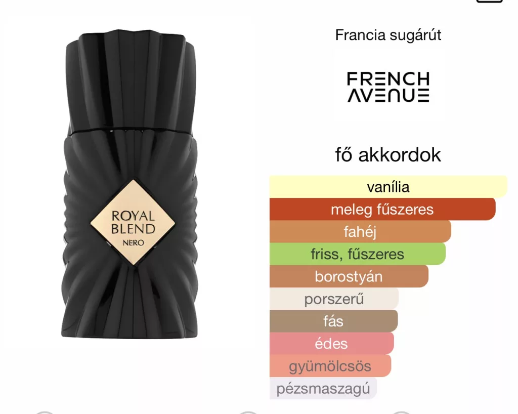 A French Avenue Royal Blend Nero egy 2024-ben debütált, keleties-fűszeres uniszex extrait de parfum, amely egyszerre modern és kifinomult. Az illat friss, gyümölcsös nyitánnyal kezdődik: a bergamott üde szikrája és az alma lédús, élénk tónusa találkozik a szerecsendió krémes-meleg árnyalatával, finoman előkészítve a kompozíció szívét.