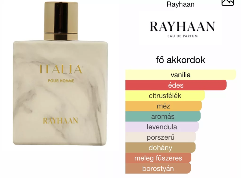 A lecsengésben a dohánylevél karakteres füstössége olvad össze a vanília krémes édességével és a tonkabab sima, meleg akkordjaival, így a Rayhaan Italia tartós, férfias és emlékezetes zárást kap. Merész, csábító és igazán magával ragadó illat azoknak, akik szeretik, ha egy parfüm egyszerre komfortos, elegáns és karakteresen édes.