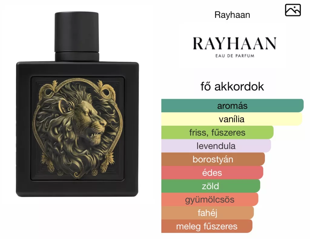 A lecsengést krémes vanília és ámbra határozza meg, melyeket a cédrus és a pacsuli száraz, fás akkordjai tesznek teljessé, biztosítva az illat határozott, tartós alapját. A Rayhaan Lion harmonikusan egyensúlyoz a fűszeres és az enyhén édeskés jegyek között: markáns, mégis kifinomult. Különösen jól érvényesül esti viseletként és hűvösebb hónapokban, amikor melegséget, eleganciát és erőt sugároz viselőjén.