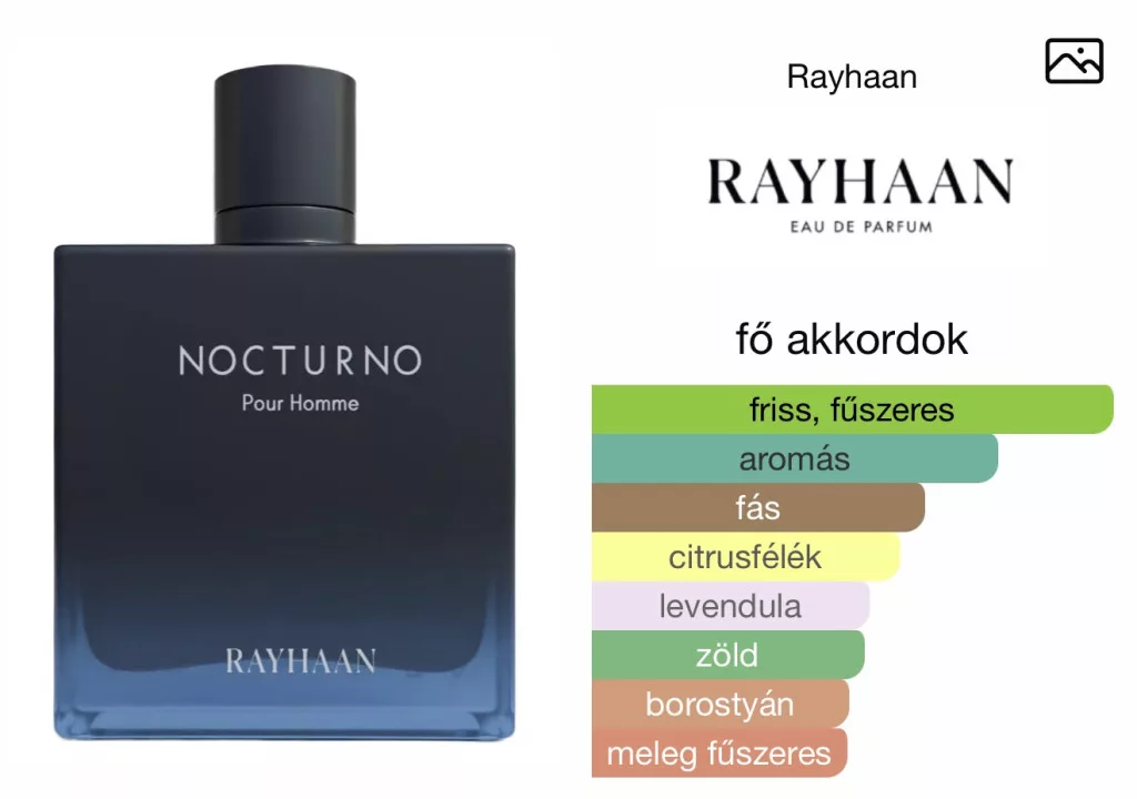 A Rayhaan Nocturno egy modern, aromás–fás férfi eau de parfum, amely 2025-ben jelent meg, és friss–fűszeres karakterével azonnal elegáns, kortárs hangulatot teremt. Már az első fújásnál érezhető a lédús bergamott, a hűs menta és a finoman csípős bors energikus nyitánya, amely friss lendületet ad az illatnak. A kompozíció szívében a levendula, a geránium és a rózsabors simul össze letisztult, férfias akkorddá, megteremtve a kompozíció kifinomult egyensúlyát. A lecsengésben ambrafás (amberwood) és cédrusos, száraz fás jegyek mélyítik el az illatot, hosszan tartó, vonzó lezárást biztosítva.