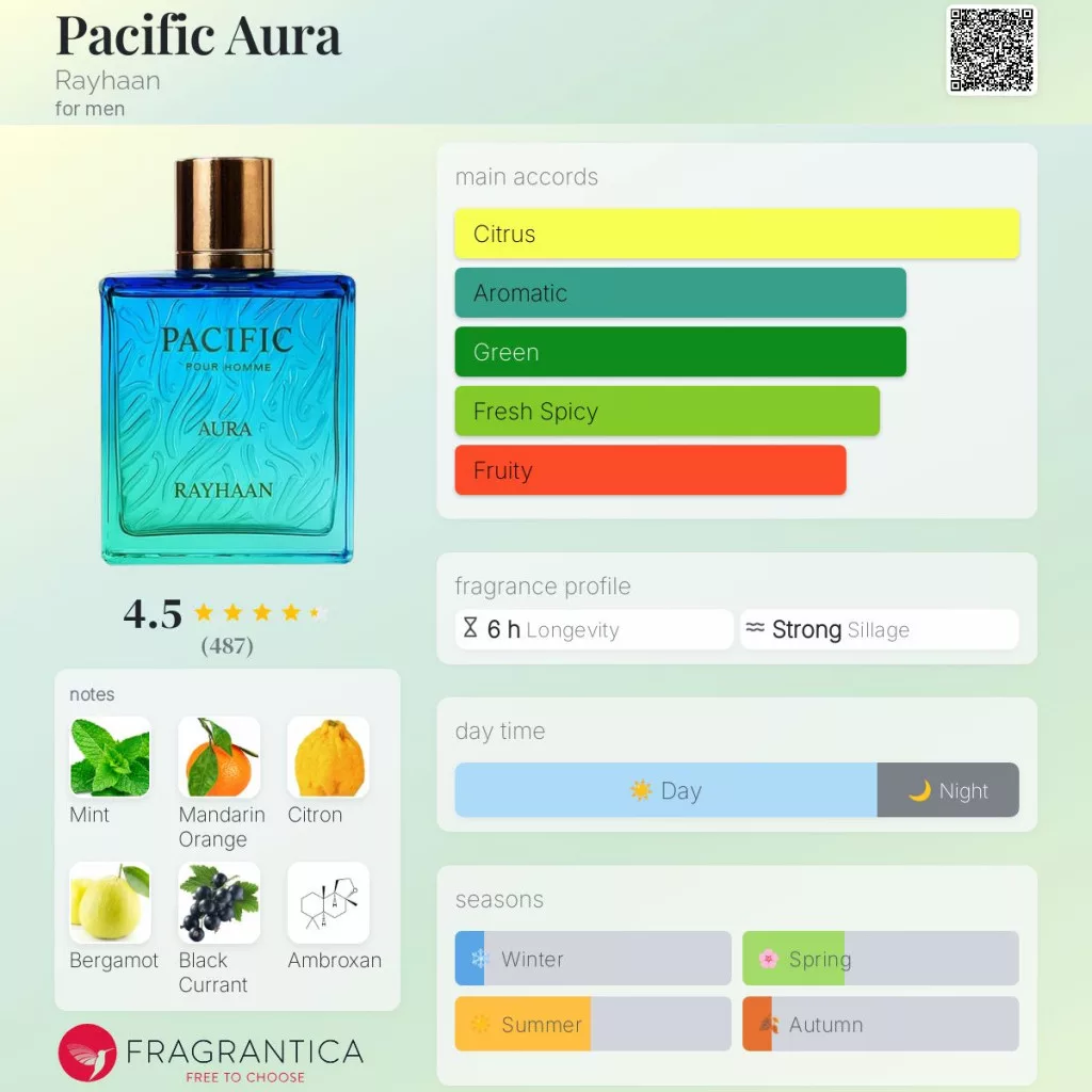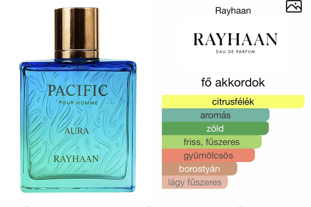 A Rayhaan Pacific Aura egy 2025-ben debütált aromás–akvatikus férfi illat, amely a friss, sós tengeri levegő érzetét idézi meg modern, energikus kompozícióban. A nyitány jeges mentával és zöldes-citrusos cédráttal indul, melyhez a mandarin és a bergamott üde ragyogása társul. A feketeribizli friss gyümölcsössége és a koriander enyhe fűszeressége élénkké, vibrálóvá teszi az első benyomást.