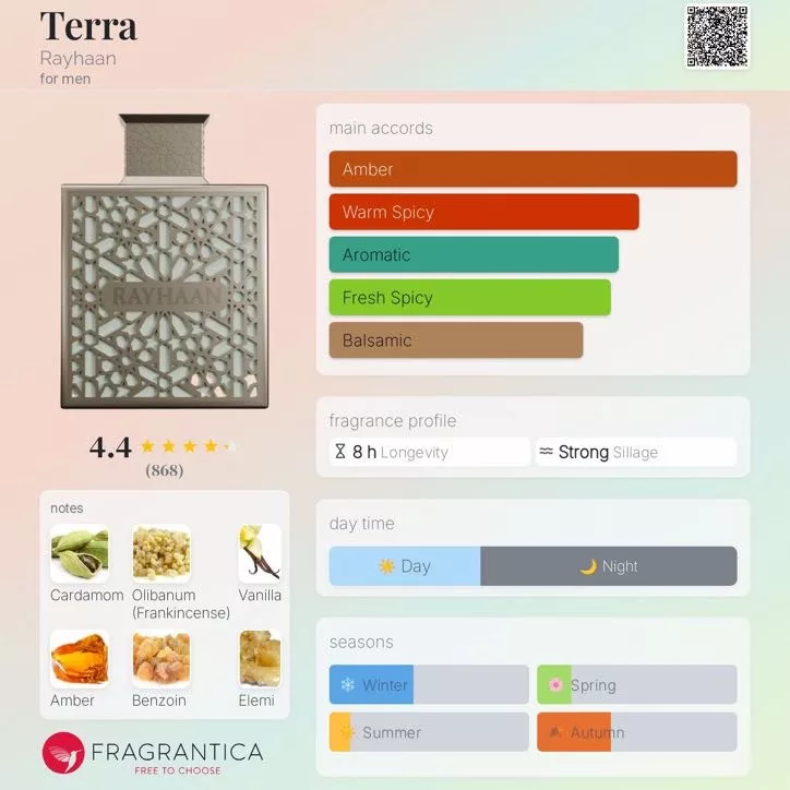 A Rayhaan Terra egy erőteljes, összetett és hosszan tartó illat, amely ideális választás azok számára, akik szeretik a mély, keleties-fűszeres kompozíciókat, és egy igazán karakteres, különleges illattal szeretnének kitűnni.