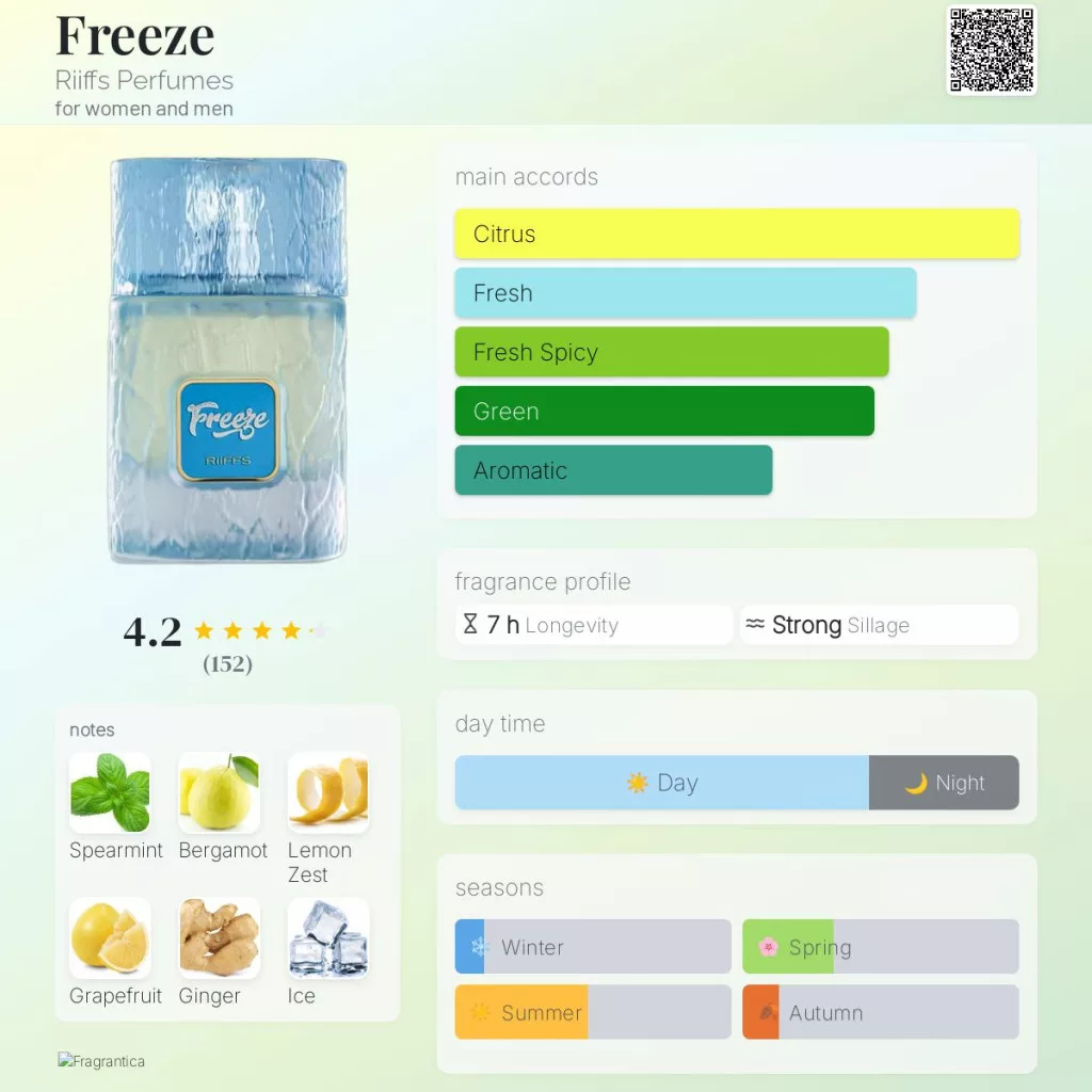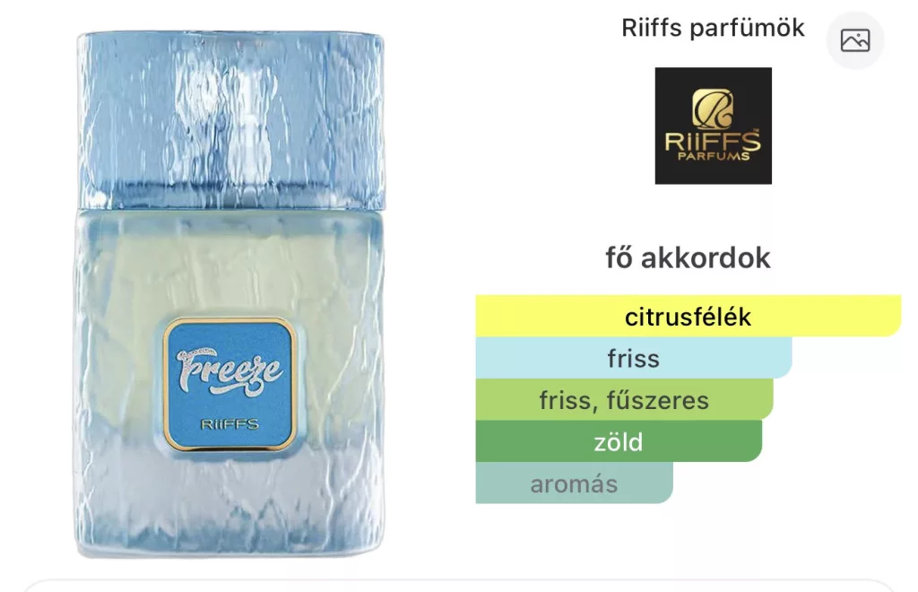A Riiffs Freeze a tiszta, mégis összetett illatművészet kortárs megtestesítője, ideális választás azok számára, akik karakteres, friss és tartós illattal szeretnének kitűnni a mindennapokban.
