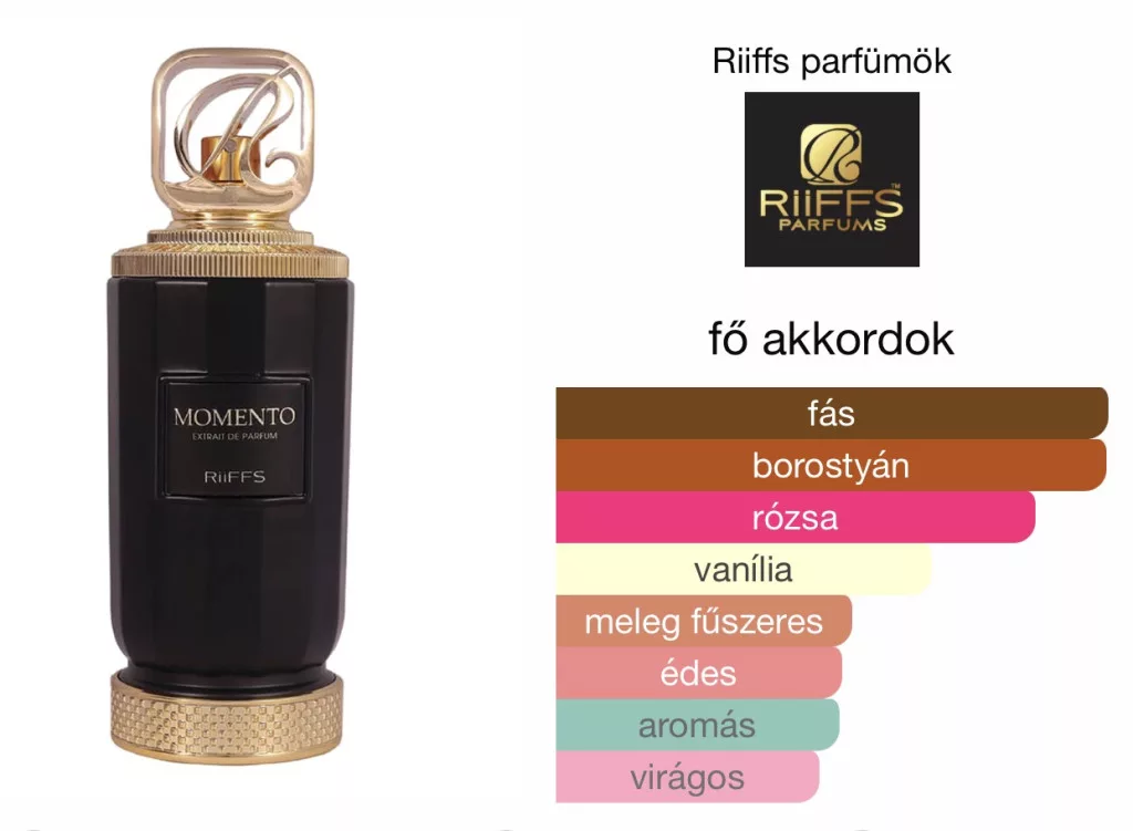 A Riiffs Momento az Arabians Tonka ihlette extrait de parfum, amely töredék áron kínál eszméletlen intenzitást. A tonkabab, a gazdag édesség, a sáfrány és egy leheletnyi oud harmonikus kompozíciója különleges mélységet teremt. Ideális választás mindazok számára, akik értékelik a gourmand parfümkészítés művészetét, hosszan tartó és karakteres illatra vágynak, és olyan elegáns alternatívát keresnek, amely a melegség, az édesség és a fás akkordok tökéletes egyensúlyát nyújtja – kifinomultabb, árnyaltabb formában, mint a Montale Arabians Tonka.